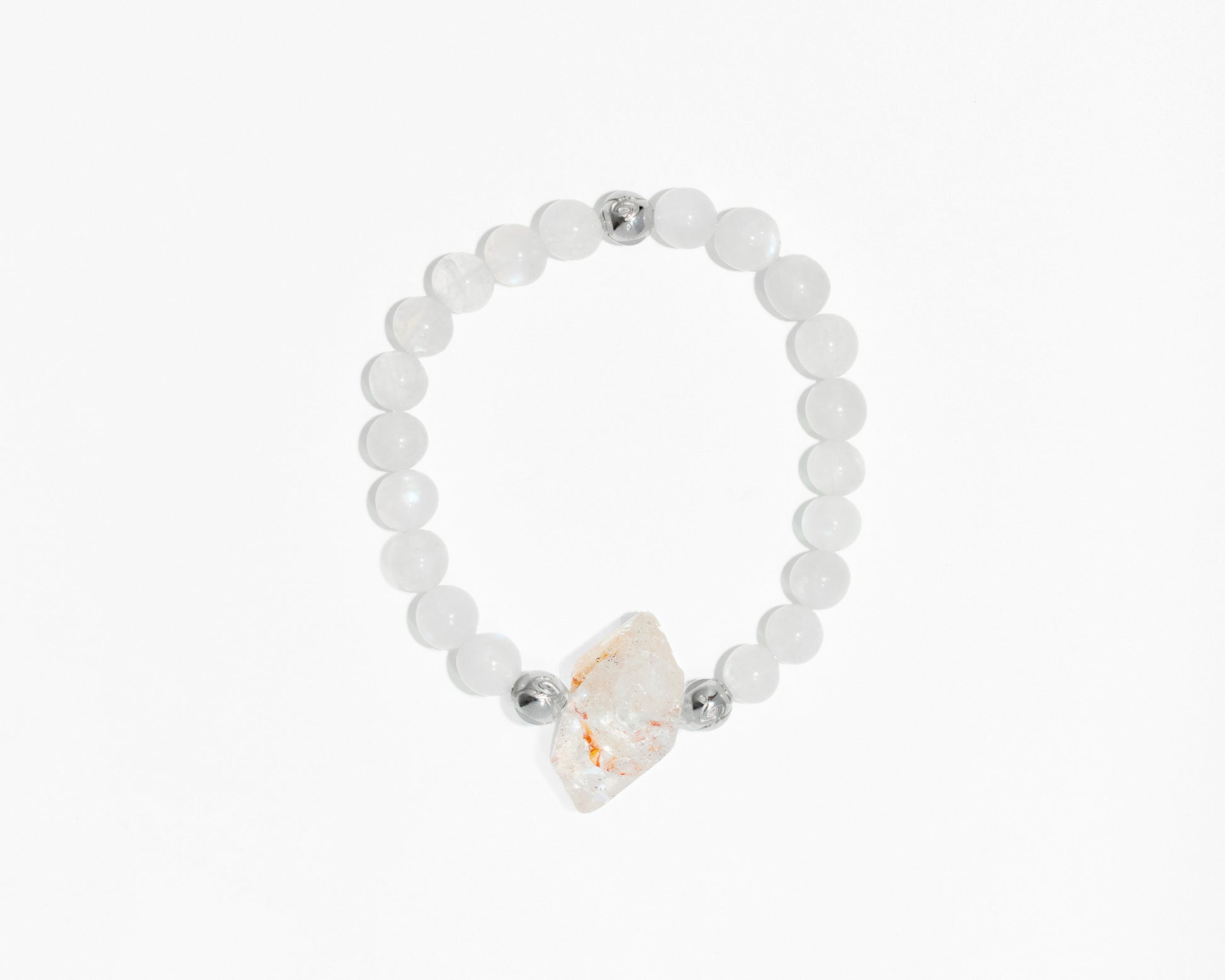 白水晶閃靈以強大的能量放大與淨化特質,協助釋放雜念與壓力;藍月光則以柔和藍暈帶來直覺啟發與情感療癒。兩者相互輝映,如同清風拂面,讓心境回到清透自在的狀態。