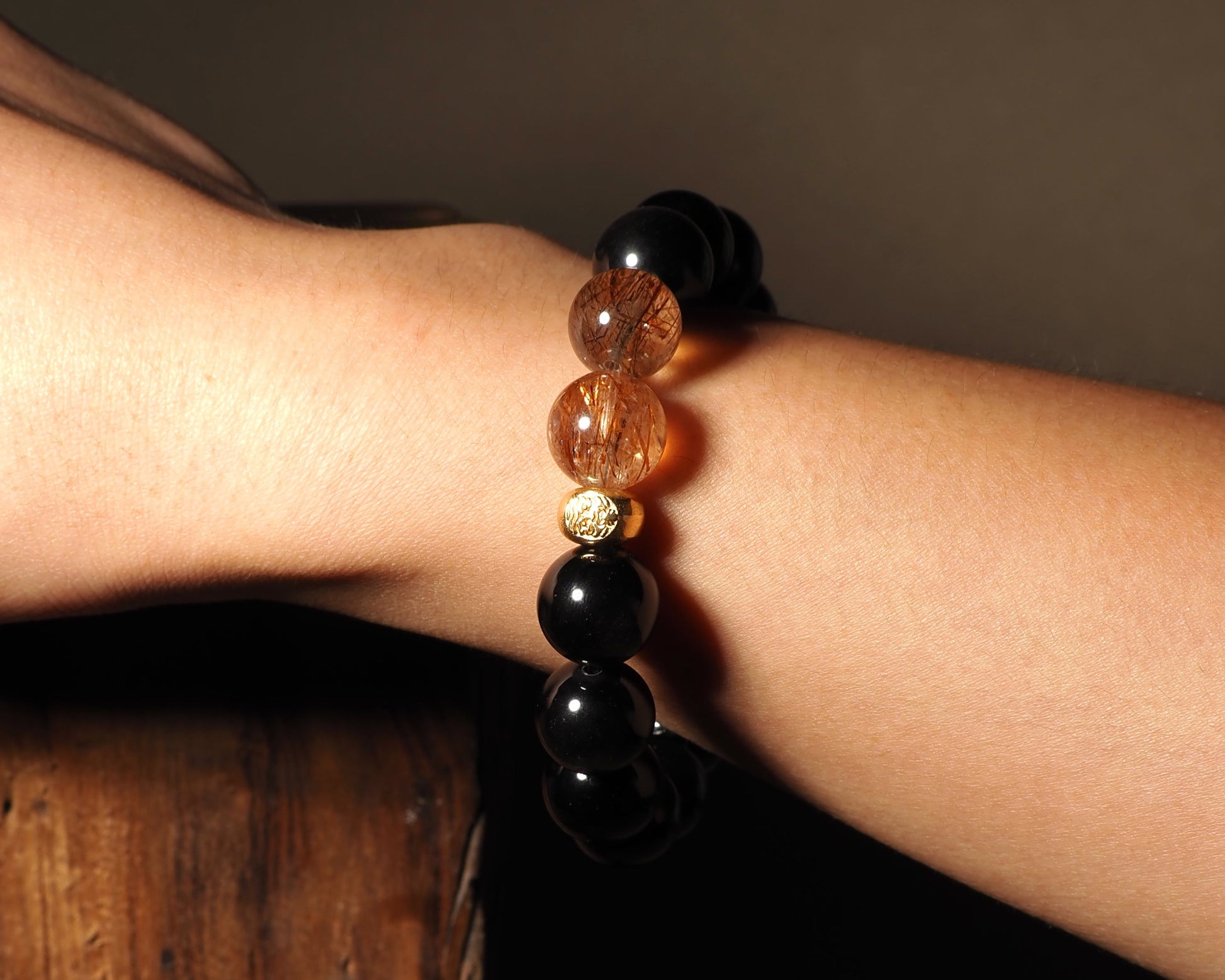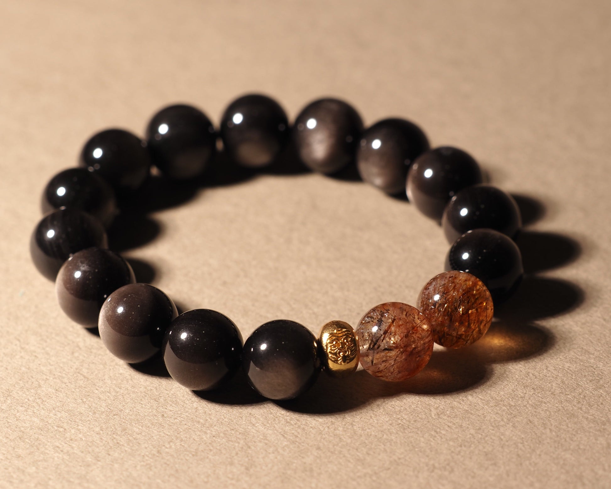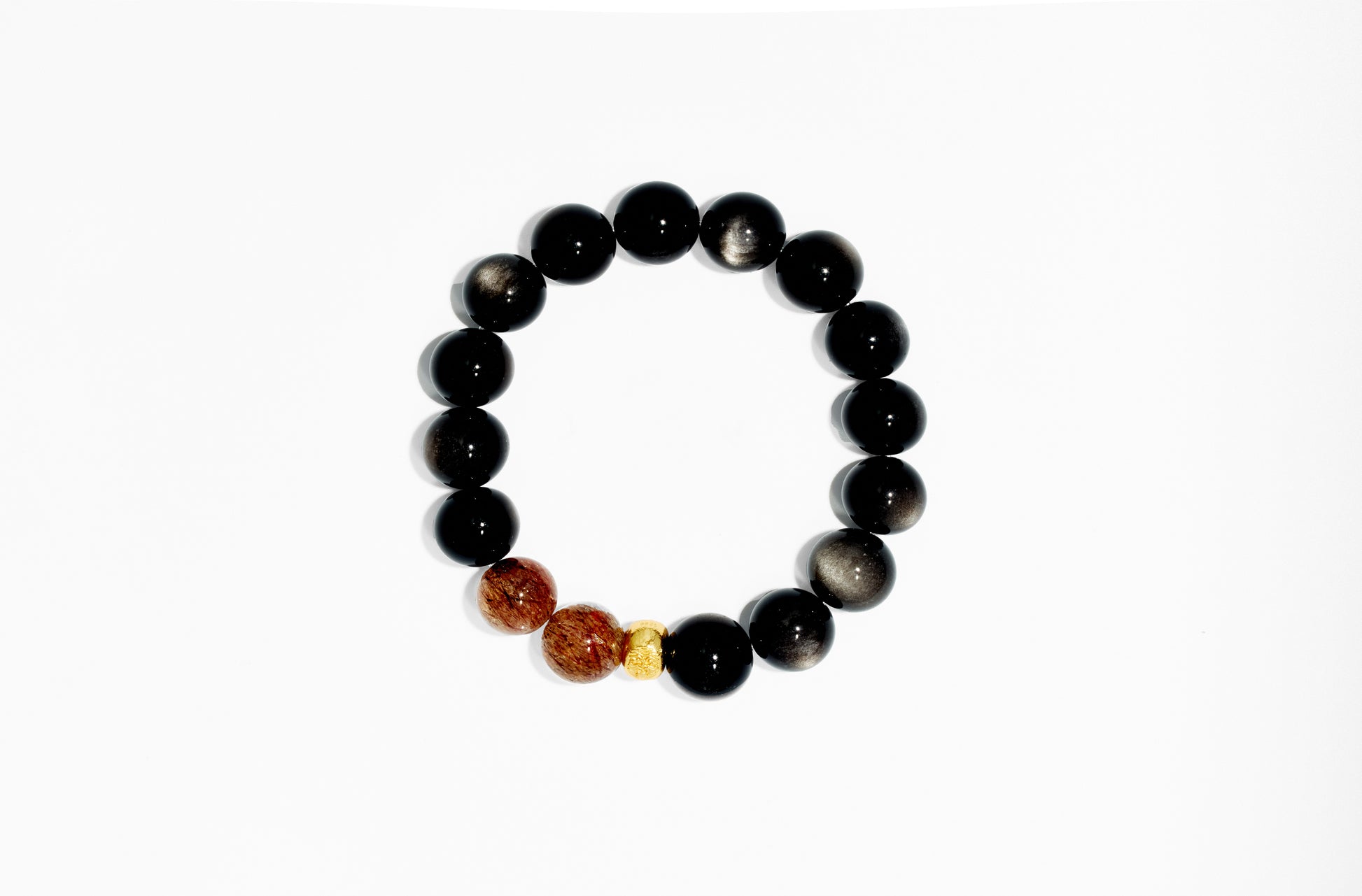 以黑曜石的強力防護能量,結合超七的靈性覺醒與全脈輪平衡,形成穩固結界。特別搭配藏傳佛教女財神——扎基拉姆(Zashi Lhamo)造型珠,象徵招財、護佑與除障。